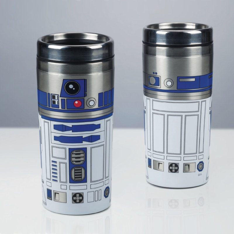 La taza está elaborada con acero inoxidable de alta calidad, garantizando durabilidad y resistencia para acompañarte en todas tus travesías. El motivo grabado en el exterior destaca la presencia única de R2-D2, el astromecánico favorito de todos. Esta taza de viaje es el compañero perfecto para llevar la esencia de Star Wars contigo a donde vayas.