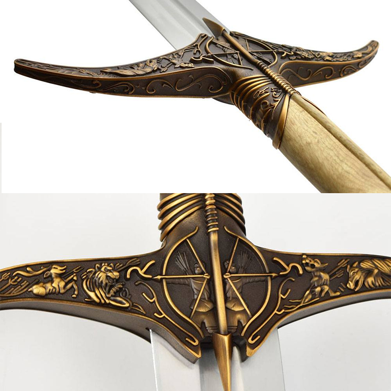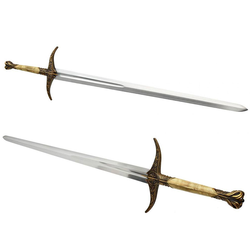 Espada Heartsbane con licencia oficial de la exitosa serie Game of Thrones® de HBO®. Está fabricada en acero inoxidable y es una edición limitada de 3000 piezas e incluye un certificado de autenticidad y una placa expositora. La colección Game of Thrones® es una serie de armas y armaduras coleccionables cuidadosamente recreadas a partir de los accesorios reales utilizados en la exitosa fantasía épica de HBO® Game of Thrones®. Los coleccionables con licencia oficial están hechos de materiales de la más alta calidad y han sido elaborados con especial atención para reproducir los detalles auténticos que se encuentran en los accesorios. Cada espada está serializada y vendrá con un soporte de pared y un certificado de autenticidad. Longitud total: aprox. 136 cm. Longitud de la hoja: aprox. 102 cm. Material de la hoja: acero inoxidable. Empuñadura: Madera dura con piezas de mango chapadas en bronce antiguo Placa: Madera serigrafiada con sello de alquitrán. La espada ancestral de la casa Tarly, Heartsbane, era típicamente llevada por Lord Randyll Tarly, quien primero sirvió como general de los Tyrell, pero luego comandó ejércitos Lannister después de la caída de la casa Tyrell. El sigilo de la Casa Tarly es un cazador a zancadas y la empuñadura de la espada está elaboradamente decorada con motivos de caza. Randyll Tarly fue quemado vivo por Daenerys Targaryen por negarse a arrodillarse y aceptarla como reina. Sin embargo, no tenía Heartsbane con él en ese momento, habiéndolo robado su hijo mayor, pero menos favorecido, Samwell, quien se lo llevó al norte después de una pelea con su padre. En la víspera de la Batalla de Winterfell, con el Ejército de los Muertos acercándose, Samwell le da la espada Valyrian Steel a Jorah Mormont para que la use en la lucha, las propiedades especiales del metal le permiten una mayor oportunidad de derrotar a los Caminantes Blancos. Hacia el final de la batalla, Jorah usa la espada para proteger a Daenerys, salvándola pero a costa de su propia vida.