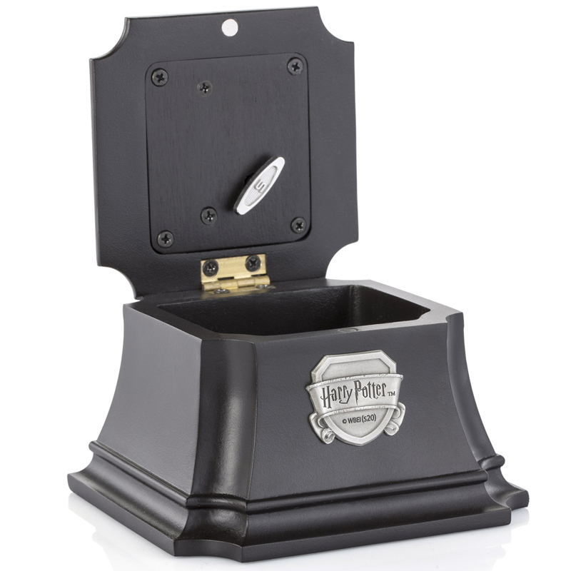Preciosa caja oficial de música del Castillo de Hogwarts. El precioso castillo está esculpido en estaño y reposa sobre una base marrón oscuro, el tema de Hedwig suena cuando se levanta la tapa con bisagras. La parte inferior de la caja de música está forrada para proteger los tesoros guardados en ella. El tamaño aproximado es de 15 x 13 x 13 cm. El complemento perfecto para los fans de la saga más mágica.