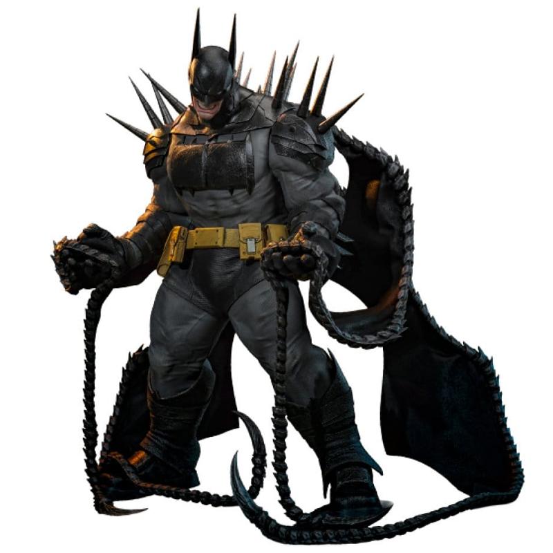 El diseño del traje refleja una estética intimidante y funcional, con armadura en cuello y hombros y opciones de pinchos intercambiables que permiten personalizar su presencia, desde una silueta más sobria hasta una versión absolutamente agresiva. El icónico símbolo del murciélago en el pecho es extraíble mediante sistema magnético y se integra con el Bat-Axe, reforzando la narrativa brutal de este Batman. El nivel de detalle continúa en la capa con alambres internos en modo alas, ideal para poses dinámicas, junto al cinturón amarillo, las botas altas y un arsenal que incluye hacha, escopeta y diferentes expresiones faciales intercambiables, todo pensado para reproducir escenas impactantes del cómic.