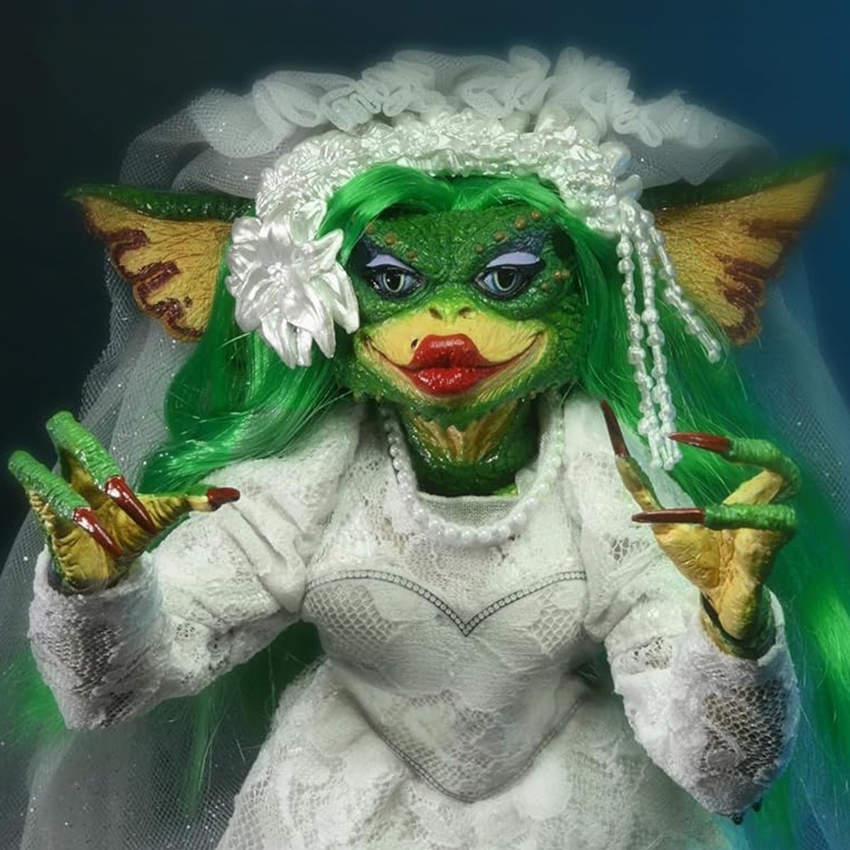 Una pieza icónica del cine fantástico cobra vida en esta espectacular figura Gremlins 2 Ultimate Greta novia, diseñada para destacar en cualquier colección desde el primer vistazo. Inspirada directamente en Gremlins 2: The New Batch, esta figura Gremlins Greta boda reproduce con un nivel de detalle sobresaliente a uno de los personajes más memorables de la saga, combinando fidelidad cinematográfica y acabados premium pensados para coleccionistas exigentes. Con una altura aproximada de 15 cm, equivalente a la escala 7 pulgadas, Greta aparece vestida con su elegante traje nupcial, confeccionado en tela real junto a un delicado velo que aporta realismo y presencia visual, mientras su cabello sintético verde intenso refuerza su personalidad única. La expresión facial, el esculpido de la piel y las proporciones están cuidadosamente trabajados para transmitir el carácter provocador del personaje, convirtiendo esta figura coleccionable Gremlins en una auténtica joya para vitrinas y estanterías. Incluye manos intercambiables y un bouquet de boda que permiten variar la pose y enriquecer la exposición, además de presentarse en una caja vitrina temática con solapa ilustrada que protege la pieza y realza su valor como artículo de colección. Esta figura Gremlins 2 The New Batch no solo rinde homenaje a una película de culto, sino que aporta exclusividad, calidad y un fuerte impacto visual, ideal para quienes buscan productos de cine con carácter, historia y una ejecución impecable.