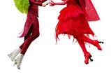 Betelgeuse, el bio-exorcista más famoso, luce su traje a rayas característico, acompañado de accesorios inspirados en la película y un corazón en la mano, listo para causar estragos. Por su parte, Lydia Deetz brilla con un vestido de tul rojo, un velo elegante, un bolso en forma de ramo de flores y zapatos esculturales que reflejan su estilo gótico y sofisticado.