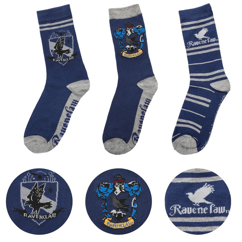 Set de 3 pares de calcetines oficiales de la casa Ravenclaw basados en la saga de Harry Potter. Disfruta de estos calcetines realizados en 98% poliéster y 2% elastán. El regalo ideal para fans de Harry Potter. Talla única válida de 35 a 45. Disfruta con este pack compuesto por estos divertidos calcetines.