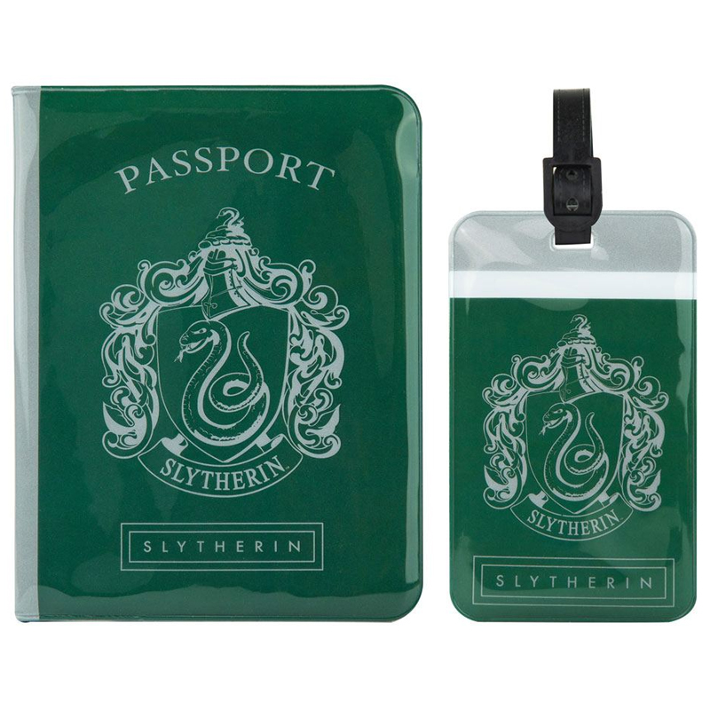 Pack de viaje Slytherin basado en la saga de Harry Potter. Este pack está compuesto por un porta pasaporte y una etiqueta de equipaje. Ambos productos están realizados en PVC de alta calidad y el porta pasaporte tiene unas medidas aproximadas de 13,5 x 10 cm., y la etiqueta para el equipaje tiene unas dimensiones aproximadas de 11,4 x 6,8 cm. Definitiva el complemento perfecto para todos los fans de la saga.