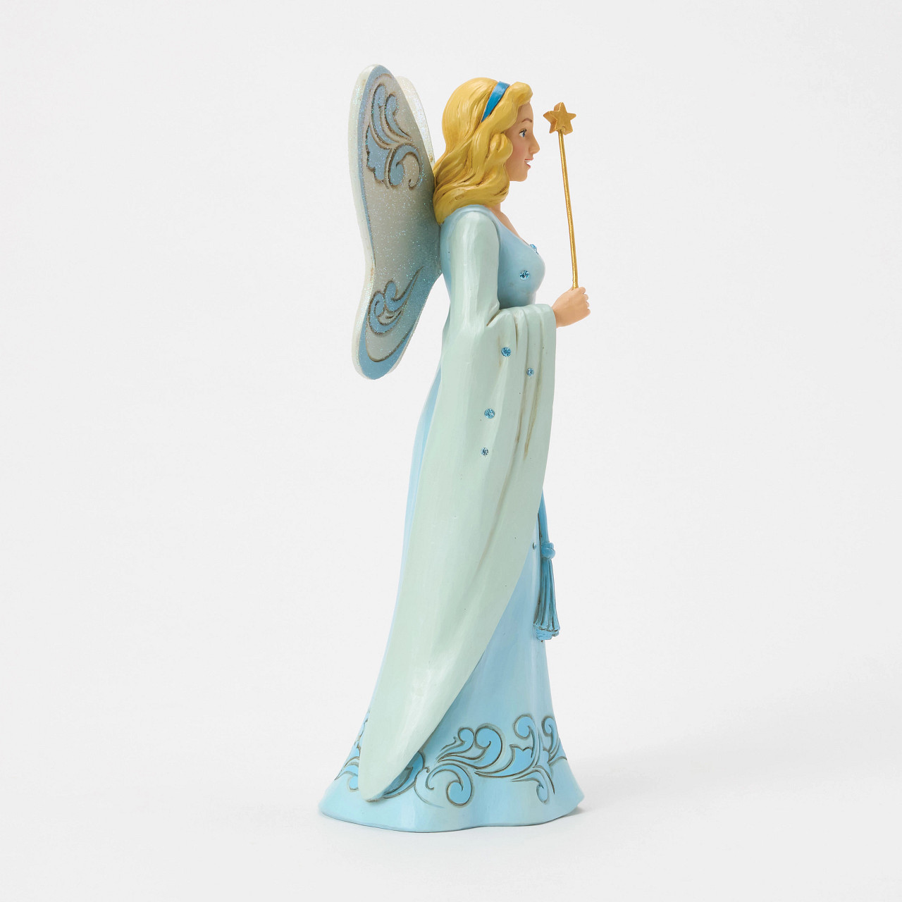 Jim Shore captura la luminosidad y la ternura del Hada Azul de Pinocho en esta elegante figura de 25,5 cm, esculpida en resina de alta calidad. Su vestido celeste luce intrincados motivos florales y arabescos tallados a mano, rematados con sutiles toques de purpurina y cristales engastados que brillan como estrellas al reflejar la luz. Con sus alas de tonos nácar y filigranas doradas, sostiene con gracia su varita mágica rematada por una estrella, lista para insuflar vida a lo imposible y guiar las conciencias con una sonrisa maternal. Una pieza imprescindible para los coleccionistas de Jim Shore y los amantes de la magia clásica de Disney.