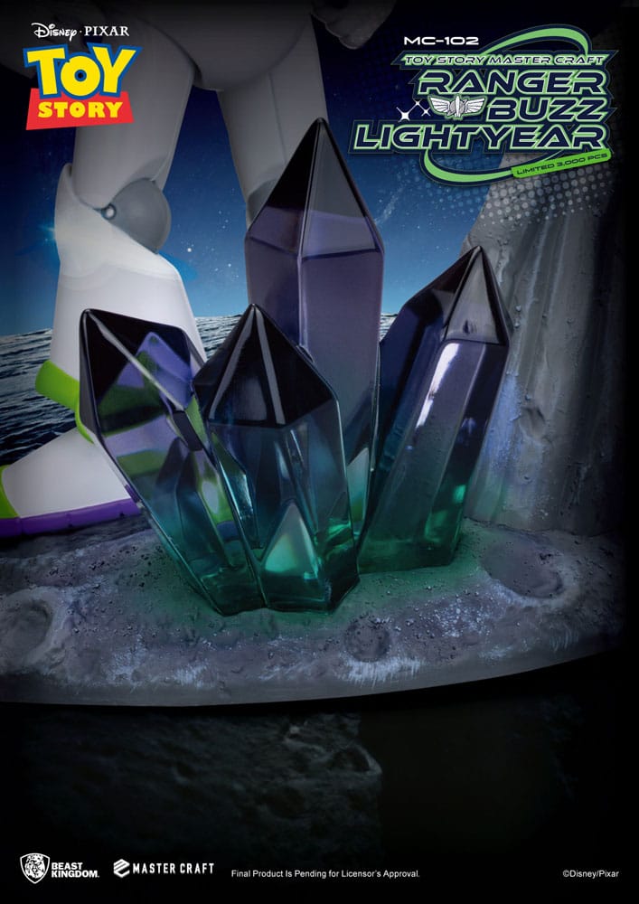 La base, inspirada en un terreno alienígena, presenta texturas rocosas y cristales negros translúcidos, aportando una atmósfera cósmica que enmarca perfectamente la postura decidida de Buzz. Limitada a 3.000 unidades en todo el mundo, cada estatua incluye una placa metálica numerada individualmente, consolidándola como una pieza exclusiva y esencial para coleccionistas serios del universo Pixar.