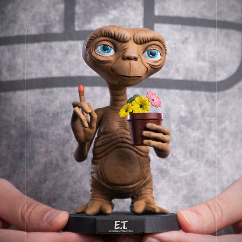 Figura E.T. El Extraterrestre MiniCo. En el año en que completa su 40 aniversario desde su estreno en la pantalla grande, Iron Studios presenta con orgullo su estatua "E.T. - ET - MiniCo", un tributo a los fanáticos y a la obra maestra de la película. Con sus expresivos grandes ojos azules y una sonrisa llena de dulzura, el pequeño y encantador visitante de otro mundo sostiene en su mano izquierda una maceta, algo especial para él como botánico extraterrestre, mientras gesticula con los grandes dedos de su mano derecha, usando su habilidades telepáticas para revivir las flores al igual que en la escena de la película que lo hizo amado y conocido en todo el mundo. La figura tiene unas medidas aproximadas de15 x 9 x 10 cm. Dirigida por Steven Spielberg, "E.T. the Extra-Terrestrial" de 1982, fue la película más taquillera en la historia del cine durante once años. La trama presenta a un extraterrestre carismático, pequeño y robusto de piernas cortas, brazos largos y cabeza gigante, que recibe el sobrenombre de E.T. cuando se hace amigo de un niño de diez años llamado Elliott. ET era parte de una expedición de un grupo de botánicos extraterrestres, que visitó la tierra en secreto para recolectar especímenes de un bosque en California, pero accidentalmente termina siendo dejado atrás por sus compañeros que huyen en su nave espacial, siendo exiliado en el planeta como un resultado. Perdido, es encontrado por Elliot, un chico que lo encuentra escondido en su cobertizo de herramientas. Ambos crean un gran conexión de amistad, y Elliot comienza a protegerlo de todas las formas posibles, para evitar que de ser capturado y convertido en un sujeto de prueba y ayudarlo a contactar a su especie y regresar a su planeta.