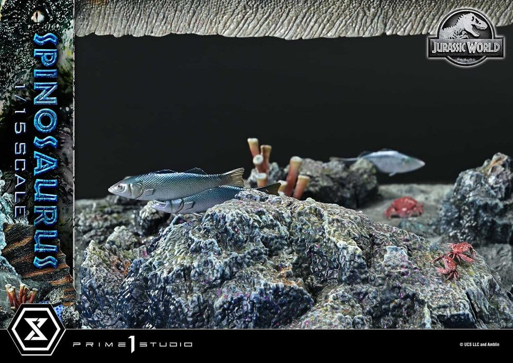 Quien quiere comprar estatua Spinosaurus Jurassic World Rebirth suele fijarse en detalles concretos, y aquí hay mucho que valorar. La piel presenta relieve trabajado, variaciones de color y cicatrices visibles que aportan profundidad, mientras que la base temática inspirada en un entorno marino añade rocas, agua, fauna y superficie escénica para reforzar el efecto de pieza única. No se trata solo de un dinosaurio de colección, sino de una composición completa pensada para coleccionismo exigente y exposición destacada.