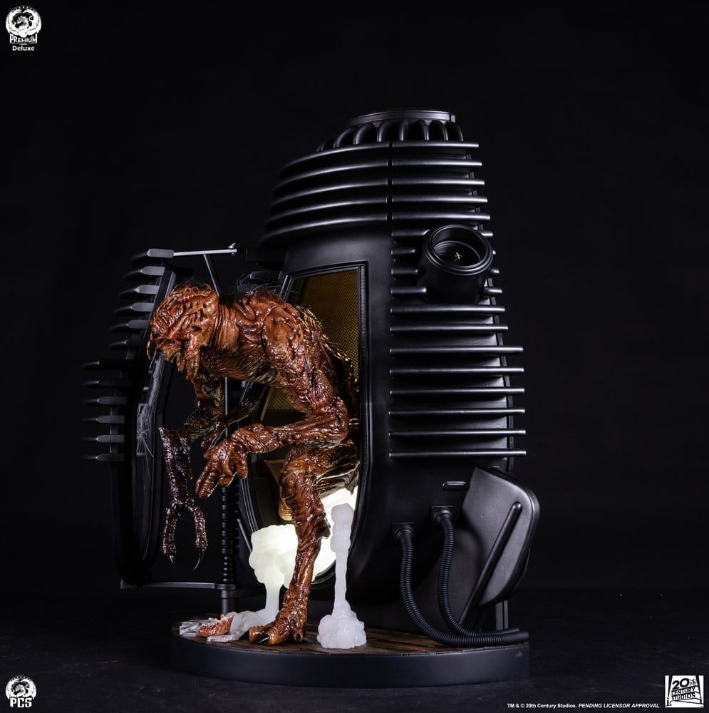 La base deluxe reproduce la cápsula de teletransporte con cristal roto, restos orgánicos y efecto de humo iluminado, aportando una escena completa y no solo una figura aislada. Ese planteamiento la convierte en una réplica de colección de The Fly ideal para exposición, decoración temática o colección personal de piezas únicas. También resulta especialmente atractiva para quien busca una estatua de cine de terror de gran tamaño, una figura The Fly de 60 cm o una edición limitada para coleccionistas con presencia auténtica.