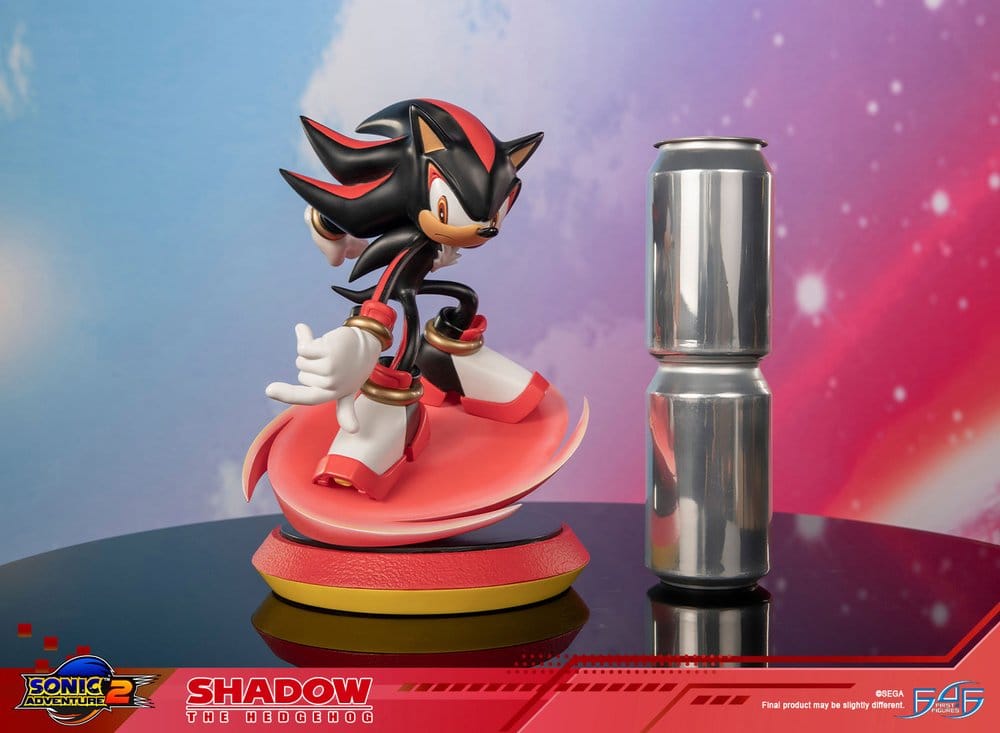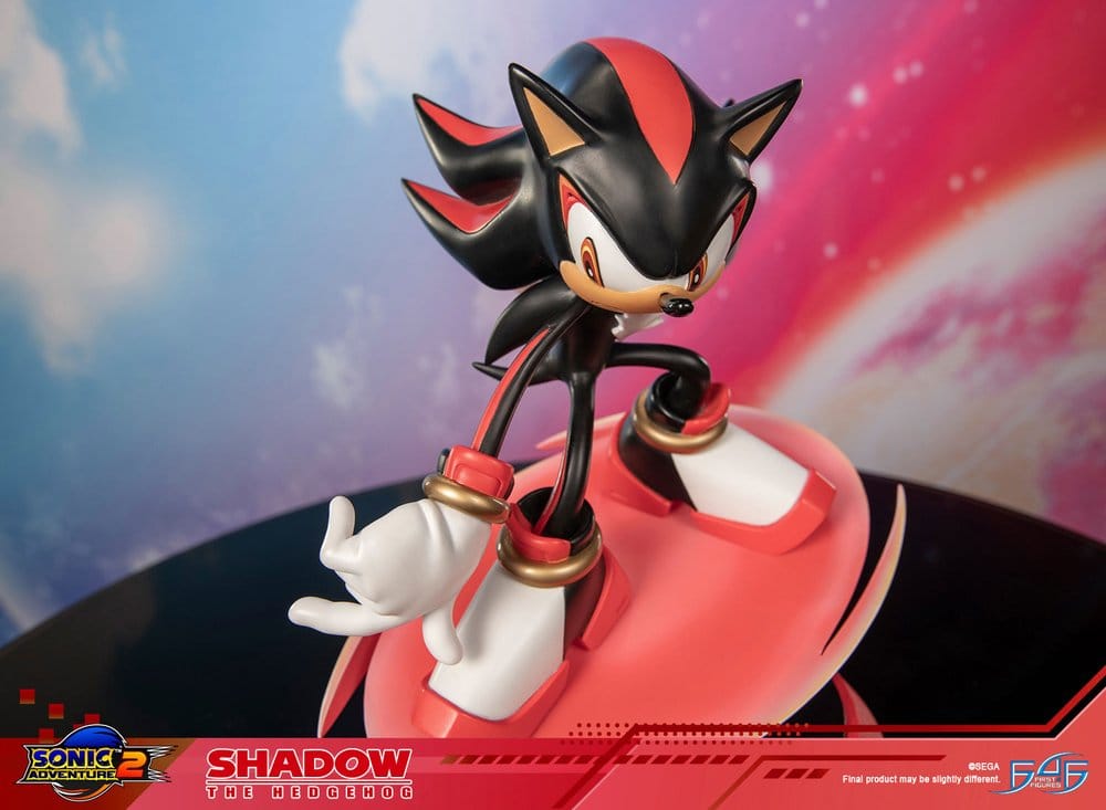 La pose está inspirada en la portada de Sonic Adventure 2 y captura muy bien el carácter de Shadow: postura baja, cuerpo adelantado, una mano extendida y la otra recogida, como si estuviera midiendo cada movimiento antes de lanzarse. El vórtice rojo aporta sensación de giro y velocidad, mientras la base circular mantiene una composición estable y equilibrada desde distintos ángulos.