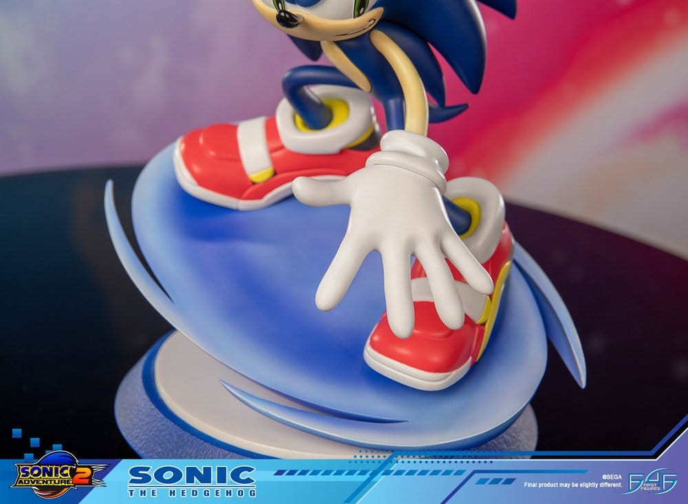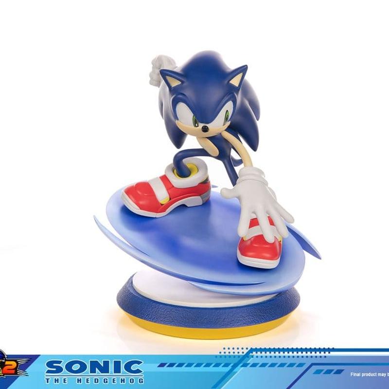 La composición reproduce la actitud icónica del personaje en una escena dinámica, con un pie apoyado sobre la espiral azul, una mano extendida hacia delante y la otra retrasada, como si estuviera a punto de salir disparado. Los acabados en azul, rojo, blanco y amarillo refuerzan el contraste de la pieza, mientras la base aporta estabilidad y una lectura visual clara desde distintos ángulos.