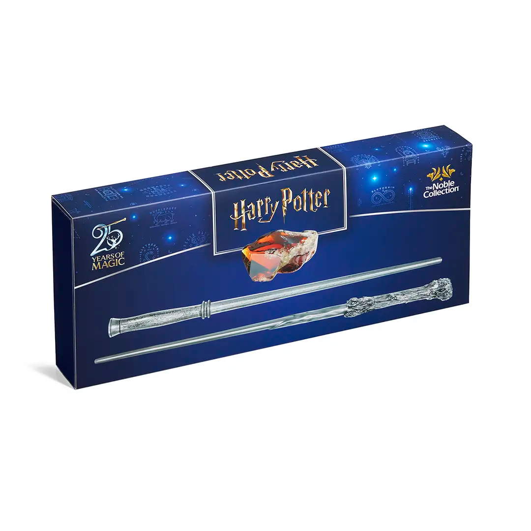 Las varitas, con medidas de 33 cm y 34,3 cm, presentan texturas detalladas y un acabado cuidado que realza su carácter icónico dentro de la saga. La Piedra Filosofal, de 7,6 cm, aporta el elemento central que da sentido a esta edición conmemorativa, convirtiendo el conjunto en una representación simbólica de la primera aventura cinematográfica en Hogwarts. Todo el contenido se presenta en una caja de colección de 38,1 x 16,5 cm, diseñada para exhibirse con orgullo y conservar las piezas en perfecto estado.