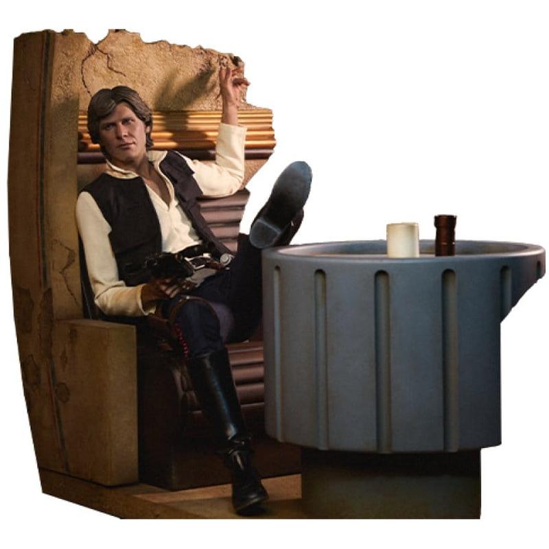 Con unas dimensiones aproximadas de 31,75 cm de alto, 33,2 cm de ancho y 18,5 cm de profundidad, esta estatua Han Solo Premium Format 32 cm presenta al carismático contrabandista relajado en un reservado de la cantina de Mos Eisley, en pleno submundo de Tatooine. La escena está cuidadosamente recreada con un banco acolchado, mesa redonda gris y una pared con acabados envejecidos que aportan textura y realismo cinematográfico. Sobre la mesa se incluyen una bebida y una lámpara con función de iluminación, creando una atmósfera auténtica y envolvente en cualquier vitrina.