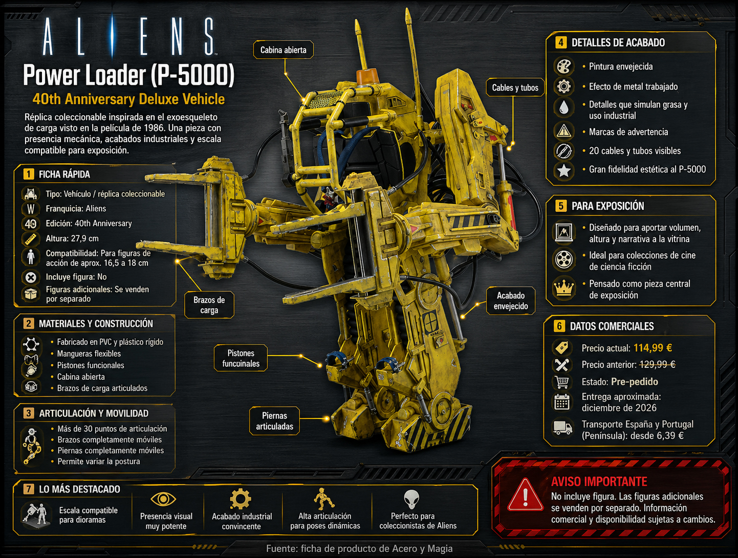 La autenticidad se percibe en los pequeños elementos: los 20 cables y tubos, la cabina abierta, los brazos de carga, las marcas de advertencia y la pintura envejecida. Todo está diseñado para que funcione tanto como réplica de exposición como producto coleccionable para quienes valoran acabados concretos, tamaño generoso y fidelidad estética.