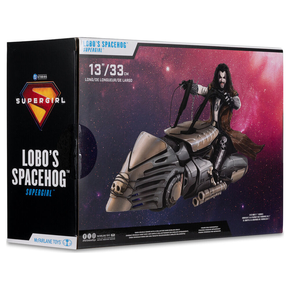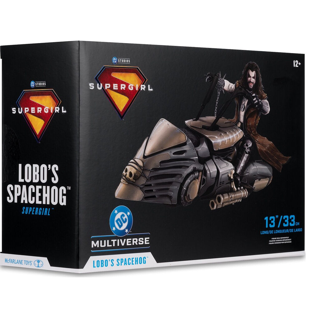 Figura vehículo Lobo's Spacehog 33 cm. No es un simple complemento de exposición, sino una pieza con presencia brutal que transforma por completo cualquier colección dedicada al universo DC y al imaginario más salvaje de Lobo.