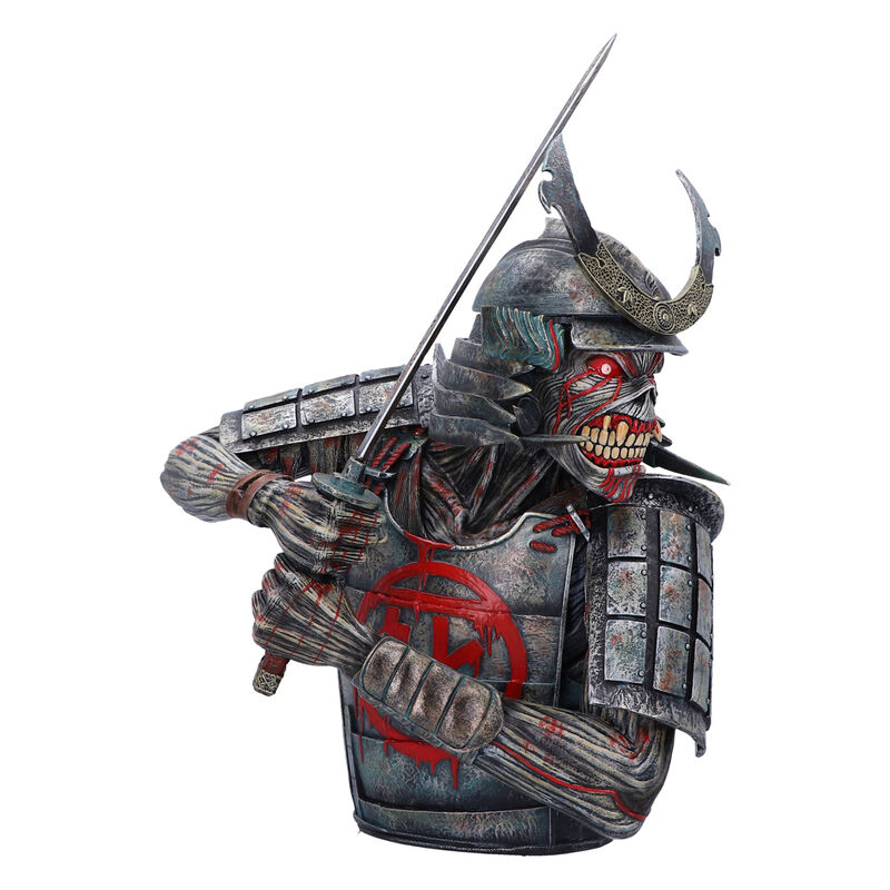 El acero parece recién marcado por la batalla, aunque todo nace de una escultura de resina. Esta caja busto Iron Maiden Senjutsu 41 cm convierte a Eddie samurái en una presencia frontal, oscura y afilada, de esas piezas que no necesitan volumen extra para dominar una vitrina.