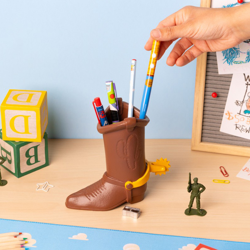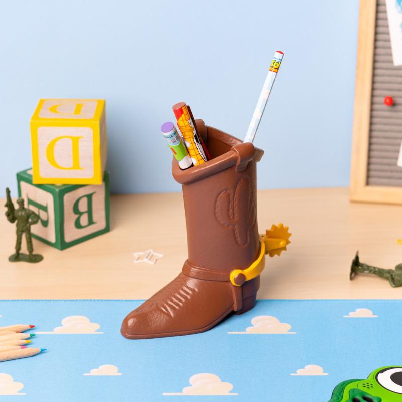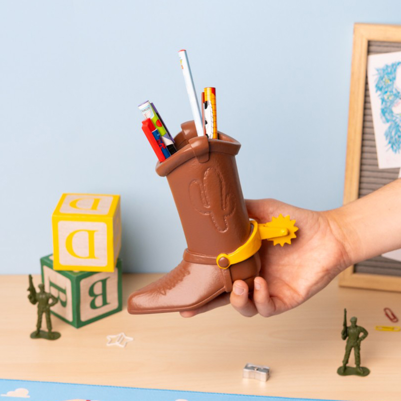 Convierte cualquier escritorio en un pequeño homenaje al universo Pixar con este set escritura Woody Toy Story Disney Pixar, una pieza decorativa y práctica que destaca desde el primer vistazo por su original diseño en forma de bota de Woody. Este bote lapiceros Disney Pixar está fabricado en resina, modelado en relieve y pintado a mano, por lo que transmite una presencia cuidada, con acabados que realzan el carácter del personaje y aportan un toque especial a la zona de estudio o trabajo. Con unas medidas de 18 x 16,3 x 8,5 cm, ofrece un tamaño perfecto para colocar sobre la mesa sin ocupar demasiado espacio, a la vez que incorpora un compartimento interior pensado para guardar y organizar el material de escritura de forma cómoda y accesible. La espuela trasera es giratoria, un detalle decorativo que refuerza su personalidad y lo convierte en un artículo muy atractivo para quienes valoran los objetos de papelería con diseño. Este lapicero Woody Toy Story incluye dos bolígrafos con tinta negra y azul, un lápiz, un portagomas y un sacapuntas, todos con diseños inspirados en la temática de la licencia, lo que aporta coherencia visual al conjunto y hace que resulte aún más especial para regalar o para completar una colección de escritorio con identidad propia. Es una opción muy recomendable para quienes buscan un accesorio funcional, resistente y con acabado de colección, capaz de mantener el orden diario sin renunciar al estilo de una de las sagas más queridas de Disney Pixar. Las características de fabricación, el contenido incluido y sus dimensiones coinciden en las fichas de venta localizadas para este producto.
