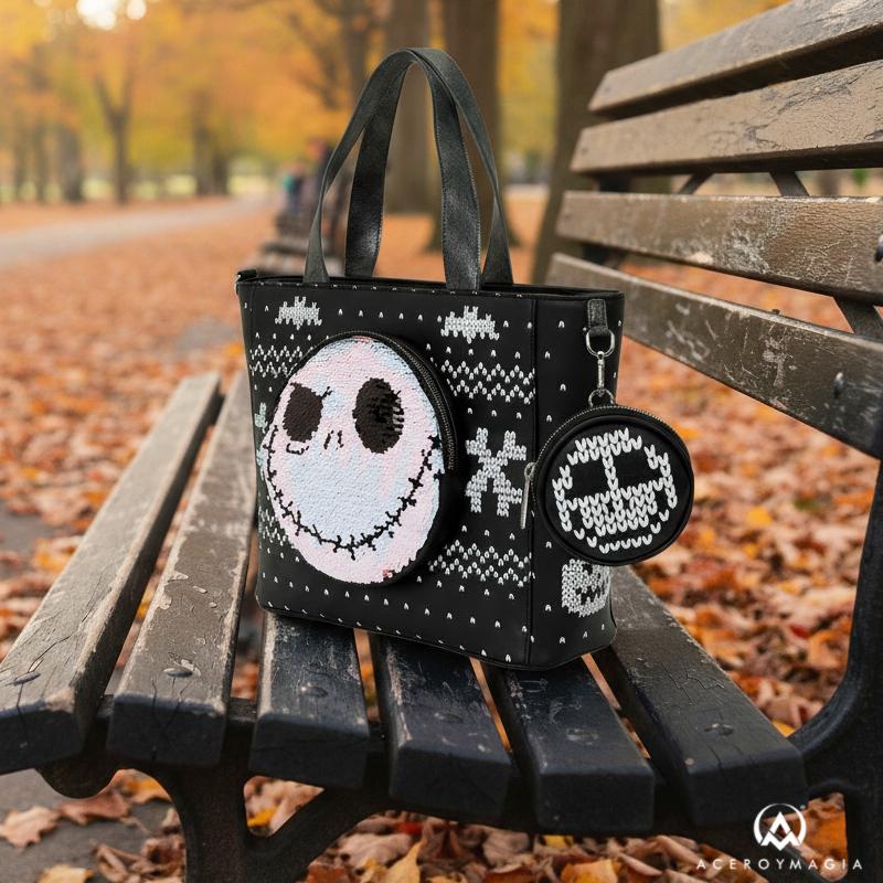 Brillo reversible y espíritu navideño en un mismo accesorio con el bolso y monedero Jack Skellington de Disney Loungefly, una tote bag de colección pensada para llevar cada día con estilo cinematográfico; el frontal de lentejuelas cambia de escena entre la icónica sonrisa de Jack y una calabaza traviesa, el monedero redondo repite la magia y la ilustración tipo jersey invernal añade murciélagos y motivos a contraste, todo en piel sintética de gran calidad con forro coordinado y correa ajustable para colgar al hombro o en bandolera; el formato cotidiano de 30,48 × 10,16 × 26,04 cm permite organizar lo esencial con comodidad, mientras su diseño con licencia oficial convierte este bolso Jack Skellington en un regalo perfecto para amantes de Pesadilla Antes de Navidad y en una pieza de merchandising de cine que acompaña desde Halloween hasta las fiestas, un accesorio versátil, resistente y preparado para lucir en cualquier look sin perder ese toque único de Nightmare Before Christmas.