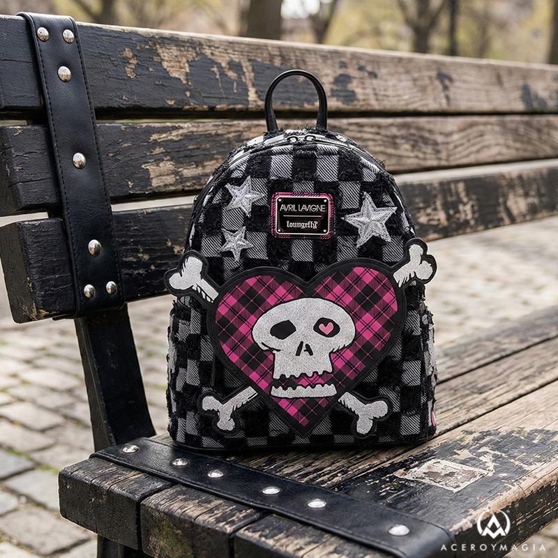 Energía punk-pop con estética dosmilera en la Mochila Avril Lavigne Loungefly 26 cm, una mini mochila con carácter que destaca por su frontal en forma de corazón con calavera y huesos sobre tartán negro y rosa, cuerpo de efecto ajedrez en negro y gris con estrellas plateadas bordadas y toques de glitter y tachuelas que elevan cualquier look; confeccionada en denim desgastado con trim de piel sintética y forro interior a juego, incorpora asa superior y correas ajustables para uso cómodo diario, mientras su formato práctico de 26,86 × 11,43 × 26,67 cm ofrece espacio real para básicos sin perder estilo; como mochila licencia oficial, esta Loungefly Avril Lavigne reúne detalles de colección y durabilidad para convertirse en tu pieza icónica de merchandising música tanto para calle como para vitrina.