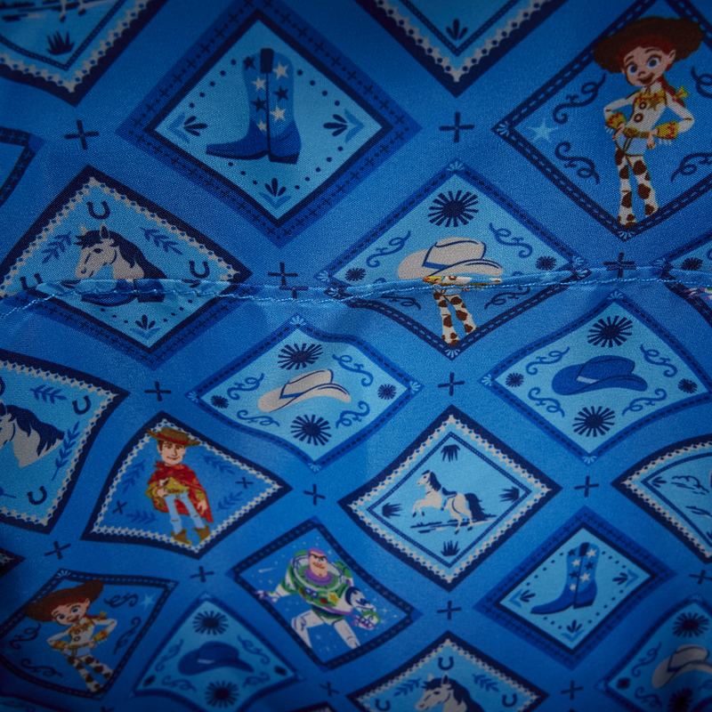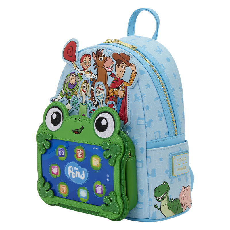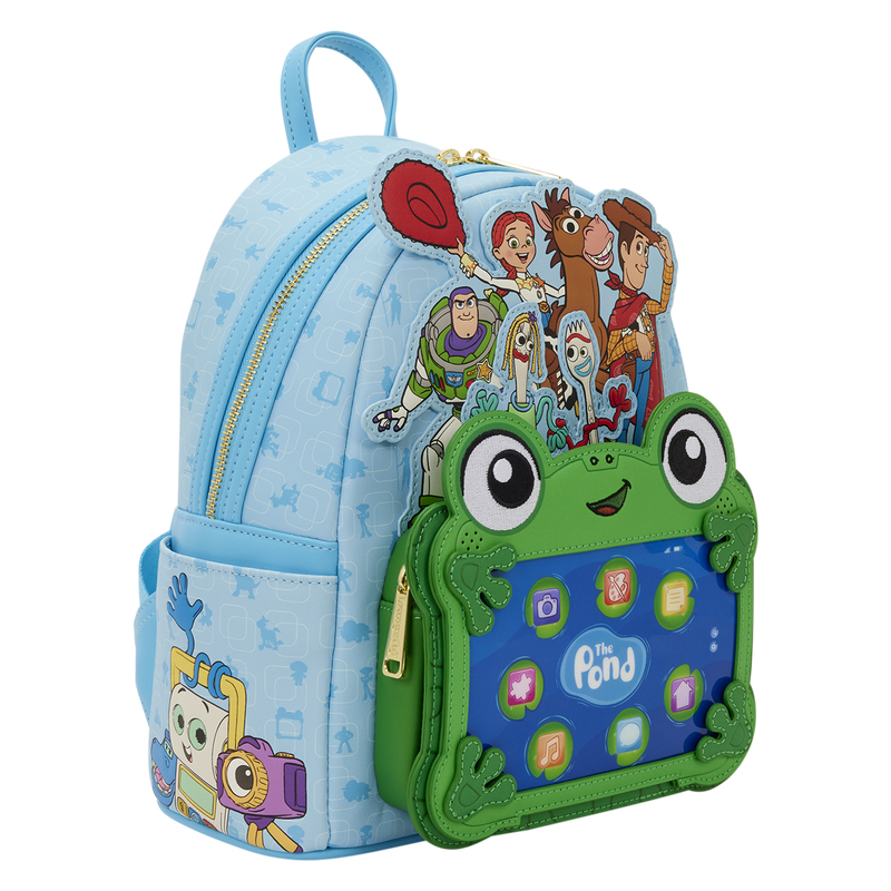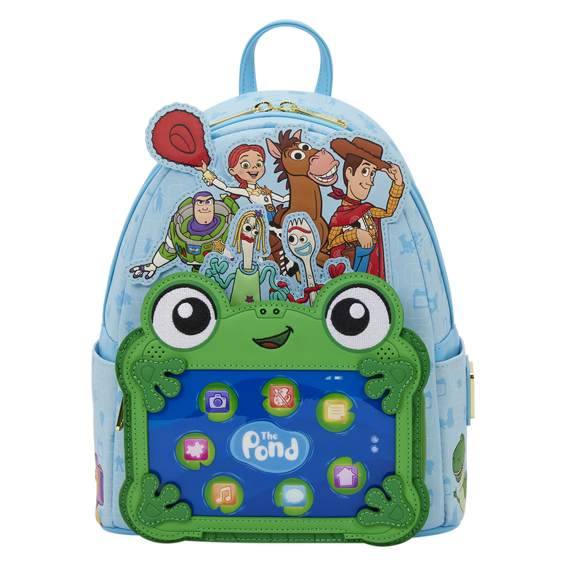 La pieza destaca por el panel frontal inspirado en “The Pond”, con acabado de PVC, detalles bordados y zonas en relieve y bajorrelieve que añaden profundidad. La rana verde en primer plano crea un efecto casi tridimensional, mientras los personajes agrupados en la parte superior aportan color, movimiento y una lectura inmediata para cualquier coleccionista de Toy Story.