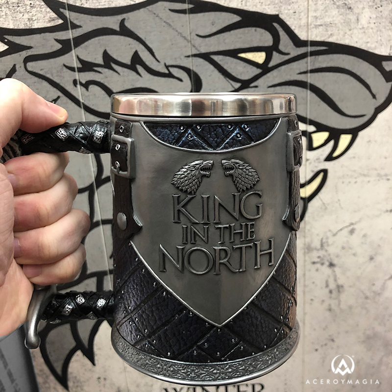 Preciosa Jarra de Cerveza del Rey del Norte de Juego de Tronos. Esta preciosa obra de arte está realizada en acero inoxidable y resina con una capacidad 600 ml, con unas dimensiones aproximadas 16 x 14,7 x 11,1 cm. Probablemente una de las mejores jarras que veas de la famosa serie de HBO. Esta preciosa jarra tiene el escudo de la casa Stark y el lema "King In The North". La jarra está pintada a mano y puede retirarse la parte de acero inoxidable para facilitar la limpieza. No dejes pasar el regalo perfecto para los fans de Juego de Tronos y de la cerveza bien fresquita.