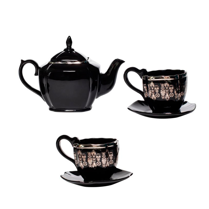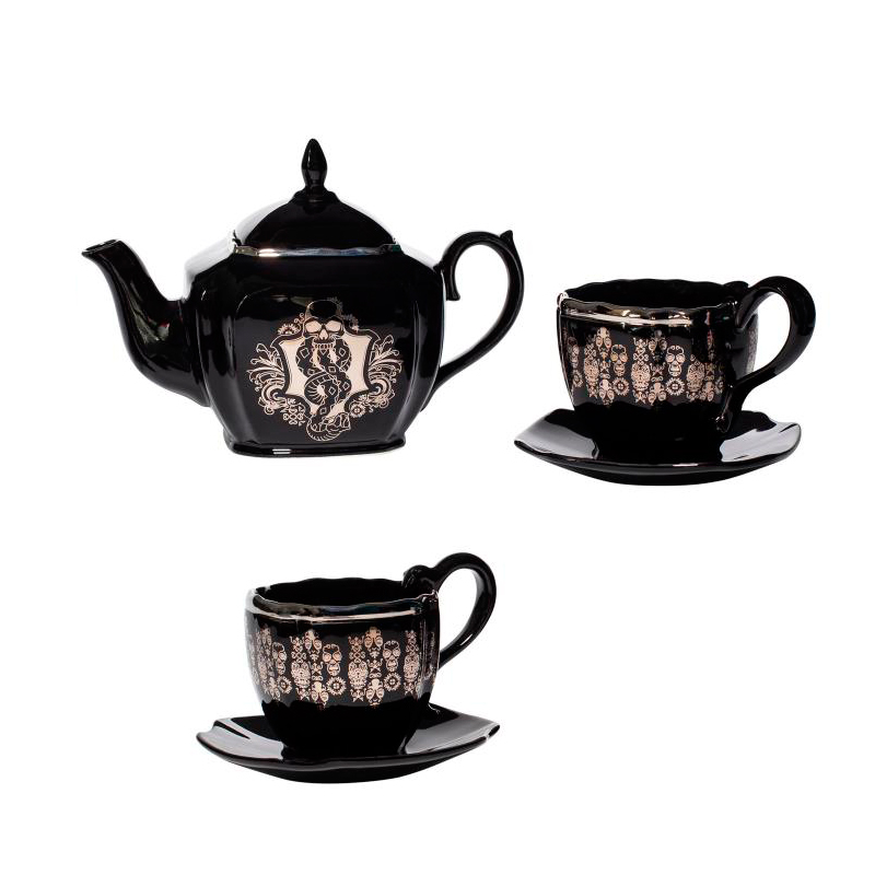 Set de Té de Dark Arts basado en la saga de Harry Potter. Disfruta de tu té preferido con este juego de té de Dark Arts realizado en gres, el juego está compuesto de una tetera de 600 ml y dos tazas de 230 ml. Únete al lado del que no puede ser nombrado. Los mortífagos han dejado su huella en este juego de té. Lavar únicamente a mano. No apto para lavavajillas y microondas.