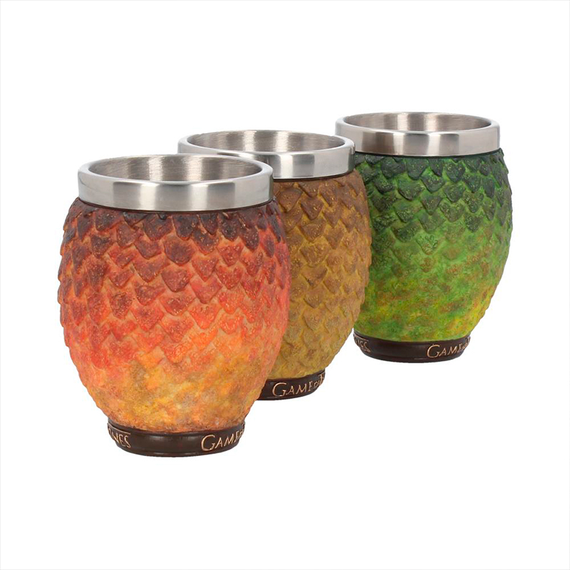 Set compuesto por tres vasos de Drogon, Viserion y Rhaegal basados en la popular serie de HBO Juego de Tronos. Este espectacular set está compuesto por tres vasos realizados en resina y acero inoxidable con una capacidad aproximada de 75 ml., inspirados en los huevos de dragón de Drogon, Viserion y Rhaegal, uno rojo, uno verde y uno amarillo. Las escamas se iluminan hacia la parte inferior, sombreándose a un amarillo pálido justo antes de que se encuentren con la base marrón marcada con el logotipo de Game of Thrones. Los vasos están pintados a mano y puede retirarse la parte de acero inoxidable para facilitar la limpieza. Este precioso set viene presentado en una caja de madera con el sello de Targaryen. La caja está realizada basándose en la caja utilizada por Magister Illyrio para presentar los huevos a Daenerys. La caja tiene unas dimensiones aproximadas de 28 x 12.5 x 8 cm., y cada vaso tiene una altura aproximada de 8 cm. No dejes pasar esta pieza de coleccionista que hará delicias de fans de la serie Juego de Tronos. “¡Cuando mis dragones crezcan, vamos a recuperar lo que me robaron y destruiremos a aquellos que me hicieron daño! ¡Vamos a eliminar ejércitos y quemar ciudades!” – Daenerys.