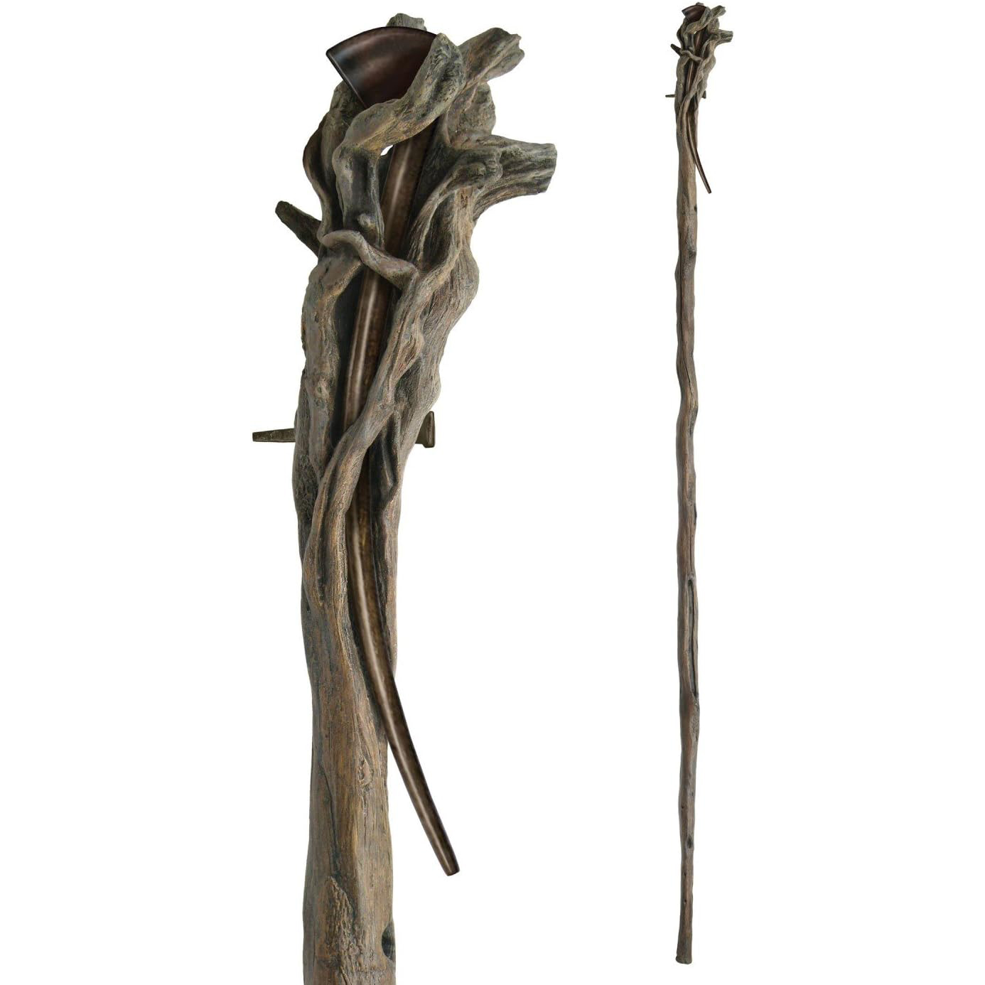 La magia de la Tierra Media se vuelve tangible con el bastón de Gandalf el Gris en réplica oficial de United Cutlery, una pieza de coleccionismo creada para lucir como un auténtico atrezzo de cine y destacar en cualquier exposición. Inspirado en los props reales vistos en The Hobbit: The Battle of the Five Armies, este bastón reproduce con fidelidad la madera retorcida, las formas de rama y raíz en la corona y el desgaste característico del viaje, respetando el espíritu del Istari y su inconfundible presencia en pantalla. Desarrollado a partir de los diseños de Weta Workshop, el acabado replica colores y texturas con un resultado visual impactante, mientras que los detalles narrativos elevan el valor de la pieza: las runas talladas, la abertura en la parte superior que en su día albergó el cristal azul y que ahora sirve para guardar la pipa, y el elemento tipo clavo largo que funciona como apisonador, evocando escenas memorables del universo de Bilbo Bolsón. Fabricado en poliresina, incluye también la pipa y el “clavo” extraíbles del mismo material, y se presenta con un soporte de pared en polystone (piedra artificial) diseñado para encajar estéticamente con el resto de réplicas de bastones de la colección, aportando una exhibición limpia, segura y con aspecto premium. Un artículo pensado para quienes valoran la autenticidad, la licencia oficial y el nivel de detalle en réplicas cinematográficas, con una estética imponente que convierte cualquier pared o vitrina en un rincón digno de la Comarca y más allá.