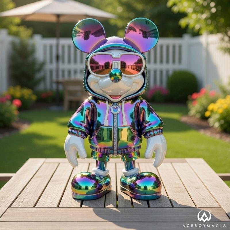 Una pieza que parece salida de una galería de arte urbano y, aun así, mantiene el icono Disney intacto: la figura Mickey grande con acabado electroplating convierte cualquier estantería en un punto focal inmediato gracias a su efecto iridiscente tipo “cromo arcoíris”. El acabado metalizado refleja la luz con cambios de color verdes, morados y azules, aportando profundidad y un look premium que destaca tanto en vitrinas de coleccionista como en decoración moderna, estudios creativos o espacios gaming. La estética se refuerza con detalles estilo streetwear —gafas, capucha y silueta robusta— que le dan un aire contemporáneo sin perder la identidad clásica de Mickey, creando una pieza perfecta para quien busca algo diferente a la figura tradicional. Su presencia “LARGE” está pensada para lucirse a distancia, elevar el conjunto de una colección Disney y combinar sin esfuerzo con estilos pop, futuristas o minimalistas, gracias a un acabado llamativo que no necesita más acompañamiento para brillar. La figura tiene una altura aproximada de 35 cm.