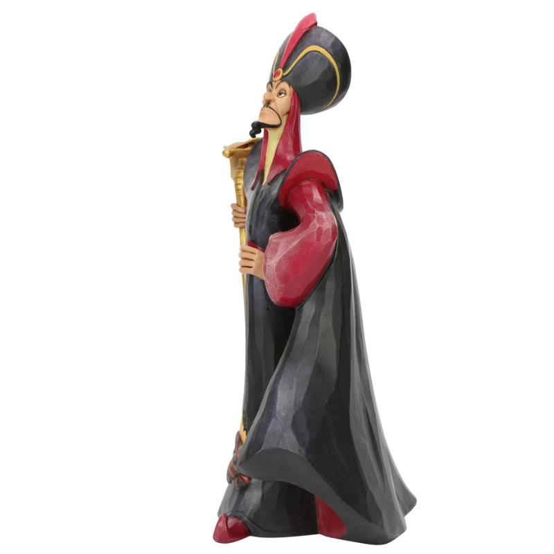 El detallado trabajo en poliresina y la pintura a mano hacen que esta figura de Jafar cobre vida con acabados en madera tallada y efecto folkart Americana. Cada trazo y expresión capturan la esencia del icónico villano, agregando un toque de realismo y autenticidad a esta magnífica pieza.