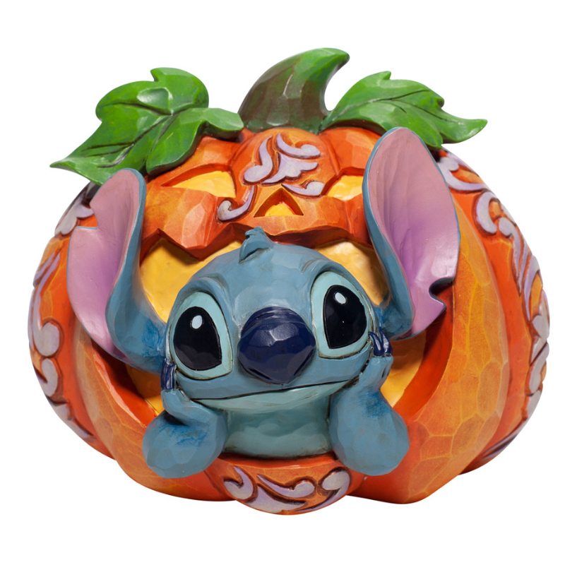 Preciosa figura de Stich basado en el popular personaje de Disney. Stitch no ha estado en la Tierra por mucho tiempo, pero ha logrado abrazar el espíritu de Halloween. Saliendo de un Jack-o-Lantern, el juguetón alienígena posa. La figura tiene unas medidas aproximadas de 10 x 16 x 13,50 cm., La figura está elaborada en poliresina y pintada a mano con acabados en madera tallada y efecto folkart Americana.