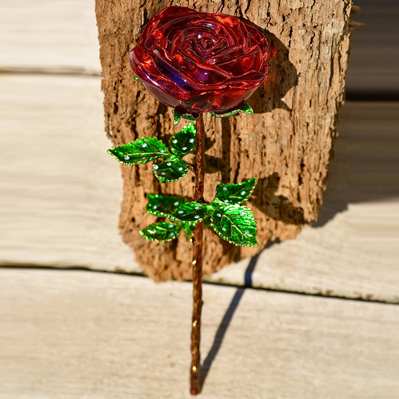 Imagina sostener en tus manos una rosa eternamente floreciente, cuyo fulgor cristalino refleja la luz en un baile de destellos. Con un diámetro de 7 centímetros y una altura de 25, esta creación trasciende lo ordinario, convirtiéndose en un regalo que traspasa los límites del tiempo y del corazón.