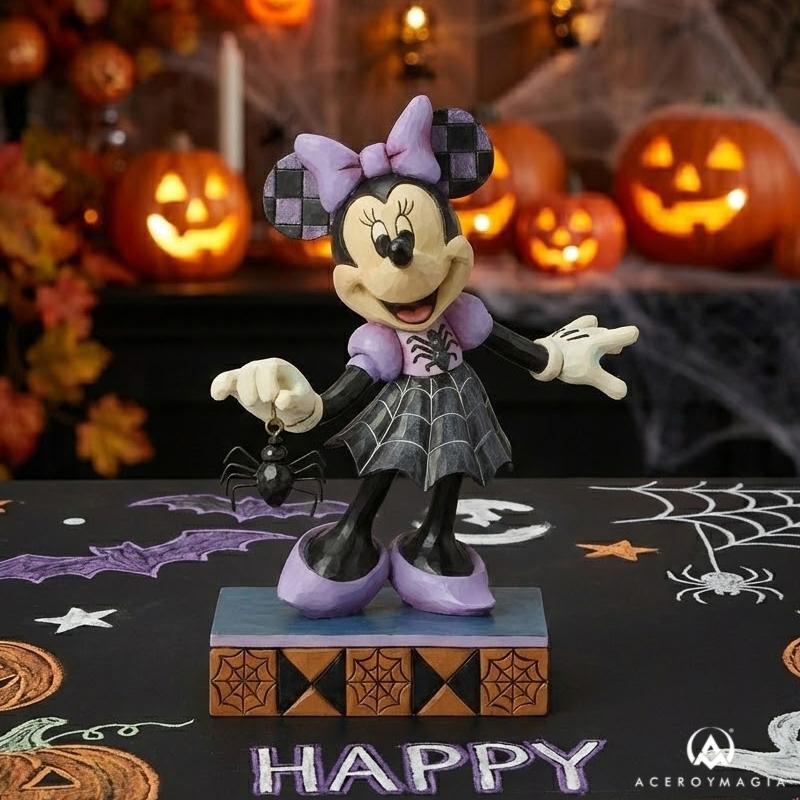 Un estilo juguetón y exquisitamente detallado da vida a esta figura Minnie in Spider Dress, una creación en resina del artista Jim Shore que destaca por su encanto artesanal y su estética festiva. Con una altura de 16,0 cm, esta pieza muestra a Minnie con un vestido decorado con motivos de telaraña y un pequeño colgante de araña que aporta dinamismo y personalidad a la escena. Las texturas talladas, los tonos violetas y los patrones geométricos característicos del artista enriquecen la composición, creando una presencia visual que se integra con elegancia en vitrinas, estanterías o rincones decorativos del hogar. Cada detalle refleja un trabajo minucioso que combina creatividad, color y un toque inspirado en el cine, convirtiendo esta figura decorativa en un elemento perfecto para quienes desean ampliar su colección con una obra llena de estilo y carácter. Su diseño aporta luz, alegría y una nota distintiva que realza cualquier espacio.