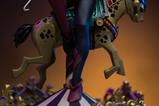 Esta figura, parte de la prestigiosa colección Art Scale, está realizada en resina de alta calidad y cuenta con unas medidas aproximadas de 30 cm de alto, 16 cm de ancho y 16 cm de profundidad. Incluye una base temática diseñada para complementar la presencia de Harley, todo presentado en una caja impresa a todo color.