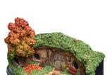 En un agujero en el suelo vivía un hobbit. No es un agujero desagradable, sucio y húmedo. Era un Hobbit Hole, y eso significa comodidad. Brillantes puertas redondas en tonos veraniegos salpican las exuberantes laderas cubiertas de hierba de Hobbiton como flores silvestres. Detrás de cada puerta, cómodas madrigueras serpentean hacia la tierra: cada una alberga a un hobbit o a una familia de gente pequeña de mejillas sonrosadas de la Comarca. Cada Hobbit Hole es único y expresa la personalidad de sus habitantes con colores, jardines bellamente adornados, muebles y los escombros rústicos de la vida cotidiana. Una puerta de entrada sin pintar diferencia esta casa del resto, pero no por ello es menos acogedora. Aprovechando el tono natural de la tierra de la puerta de entrada, un cálido tono otoñal salpica los árboles y la hiedra de los alrededores, creando una morada sutil pero acogedora. Figura de poliresina de las peliculas ´El hobbit´, tamaño aprox. 15,5 x 7 x 6 cm. Modelo finalizado