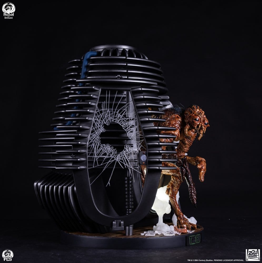 La base deluxe reproduce la cápsula de teletransporte con cristal roto, restos orgánicos y efecto de humo iluminado, aportando una escena completa y no solo una figura aislada. Ese planteamiento la convierte en una réplica de colección de The Fly ideal para exposición, decoración temática o colección personal de piezas únicas. También resulta especialmente atractiva para quien busca una estatua de cine de terror de gran tamaño, una figura The Fly de 60 cm o una edición limitada para coleccionistas con presencia auténtica.
