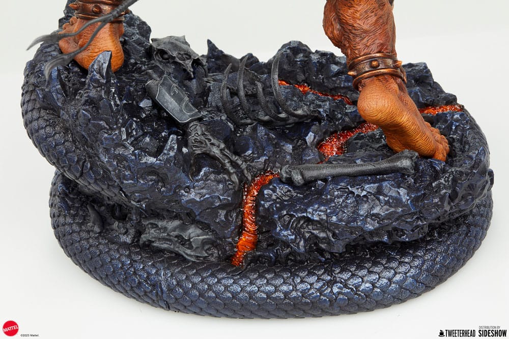 Esta nueva maqueta de Beast Man mide aproximadamente 56 centímetros de alto desde la parte superior de su espalda hasta 56 centímetros de ancho y 37 centímetros de profundidad cuando está completamente ensamblada. Cada detalle letal de esta estatua de poliresina esculpida se presenta con una asombrosa cantidad de detalle en toda su gloria reinterpretada. Armado con su látigo letal y enfundado en su intrincada armadura rediseñada, Beast Man está rodeado de detalles repensados, desde calaveras reutilizadas como armadura hasta cuchillos, herramientas y bolsas, hasta sus icónicas puntas mortales y su brújula distintiva.