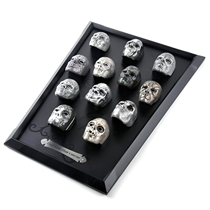 Set oficial de 12 máscaras de morfífagos basada en la saga de Harry Potter. Esta impresionante exhibición presenta las 12 máscaras únicas de los mortífagos de Voldemort. Cada máscara mide aproximadamente 7,5 cm de largo. El conjunto mide aproximadamente 42cm x 31cm y está terminado con una placa con el nombre. Viene con dos ganchos de dientes de sierra en la parte posterior para montaje en pared. El regalo perfecto para fans de Harry Potter.