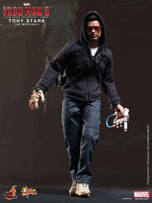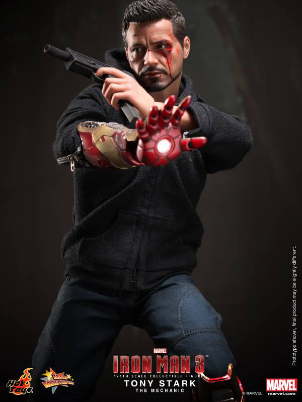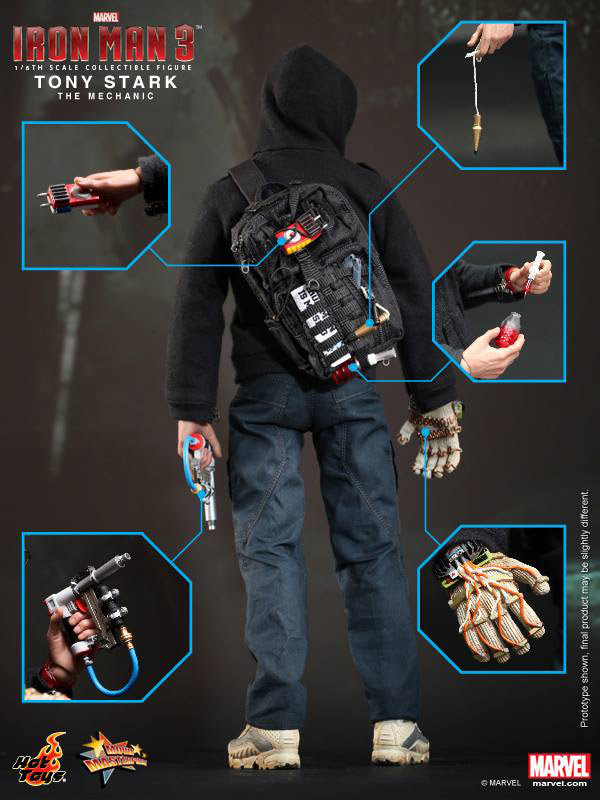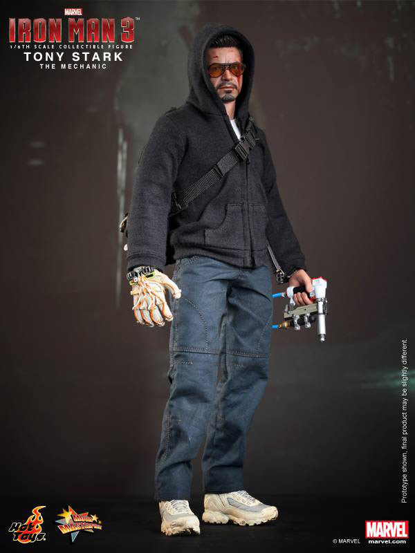 Detallada figura Movie Masterpiece Edición Limitada de Tony Stark (The Mechanic) basado en la película Iron Man 3 interpretado por Robert Downey Jr, figura creada por la firma Hot Toys basándose en los bocetos originales de Marvel para la película, la figura cuenta con más de 30 puntos de articulación que hacen casi posible cualquier posición. Increíbles detalles de pintura realizados por los artistas Yulli y JC Kong. Con todo lujo de detalles como LED’s iluminando en el RT del pecho y complementos entre los que podemos destacar infinidad de armas, pistola de clavos, reloj, mochila, periodico, envase con la jeringa, gafas de sol y el display de exhibición con una placa de identificación con el logotipo de la película. La figura tiene una altura aproximada de 30 cm.