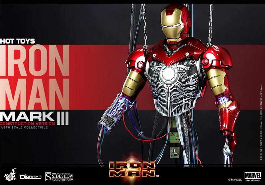 Detallado Diorama Movie Masterpiece Edición Limitada de Iron Man Mark III (Construction Version)basado en la película Iron Man interpretado por Robert Downey Jr, el Diorama ha sido creado por la firma Hot Toys basándose en los bocetos originales de Marvel para la película. Al igual que podemos ver en el film a Tony Stark reparando el Mark II colgado del techo con un sinfín de cables y demás artilugios conectados a la armadura. Ahora podrás tener la oportunidad de recrear esta escena con el taller de Tony. Los increíbles detalles de pintura realizados por los artistas Yulli y JC Kong. Con todo lujo de detalles como LED’s iluminando los ojos y el RT del pecho y complementos entre los que podemos destacar infinidad de cables, LED’s y el espectacular display basado en la película. La figura tiene una altura aproximada de 39 cm. Figura Oficial Iron Man Diorama 1/6 Iron Man Mark III Construction Version realizado por la firma Hot Toys.