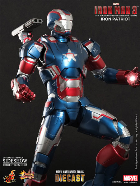 Espectacular figura Movie Masterpiece Edición Limitada de Iron Patriot basado en la película Iron Man 3 interpretado por Don Cheadle, figura creada por la firma Hot Toys basándose en los bocetos originales de Marvel para la película, la figura cuenta con más de 36 puntos de articulación que hacen casi posible cualquier posición. Increíbles detalles de pintura realizados por los artistas Yulli y JC Kong. Con todo lujo de detalles como LED’s iluminando los ojos y el RT del pecho y complementos entre los que podemos destacar infinidad de armas, flaps, manos, cabeza de Iron Man, cabeza de James' Rhodes y el display de exhibición con una placa de identificación con el logotipo de la película. La figura tiene una altura aproximada de 30 cm.