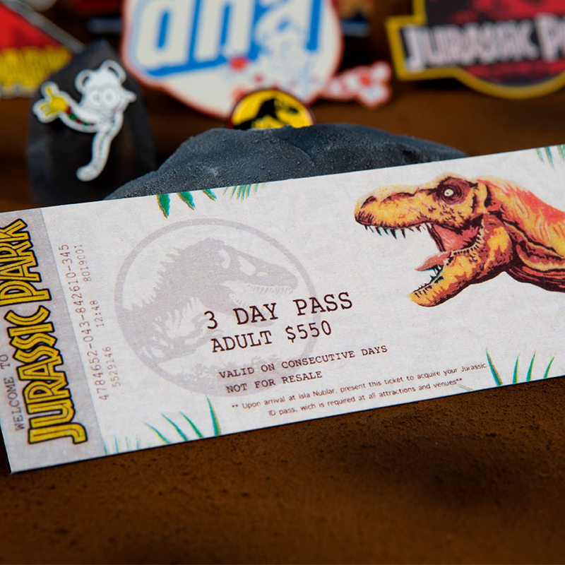 Si alguna vez te has preguntado como habría sido visitar el parque original este Kit va a hacer realidad tus sueños. Este pack está compuesto por una Edición Limitada y numerada de 1993 Unidades, un ticket de entrada al parque (numerada). Una matrícula de aluminio (réplica a la usada por los Jeeps del parque), bandera “When Dinosaurs ruled the earth” (1,40m), un mapa tríptico Jurassic Park, 18 Cromos Exclusivos “Jurassic Park Souvenir Shop” un manual “Gafas de visión nocturna”, pase VIP con correa de Jurassic Park, una Postal “Greetings from Jurassic Park”, una Postal “T-Rex Kingdom”, un pin Logo Jurassic Park, un pin Logo Mr.ADN y 3 pegatinas exclusivas.