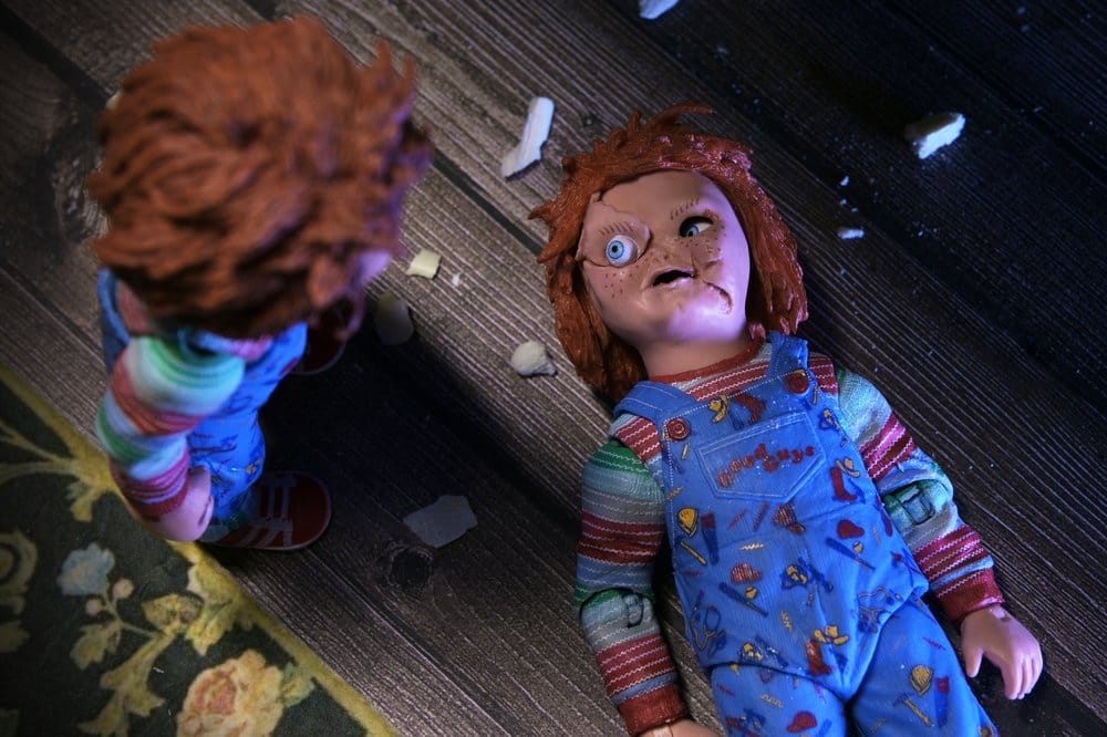 Con una altura aproximada de 17,8 cm, encaja especialmente bien en estanterías de cine de terror, vitrinas cerradas o composiciones junto a otras action figures. El cuerpo articulado permite cambiar la postura sin perder naturalidad, mientras que los acabados pintados en PVC y plástico rígido refuerzan detalles clave como el pelo rojizo, el peto azul Good Guys, la camiseta a rayas y la expresión inquietante del rostro.