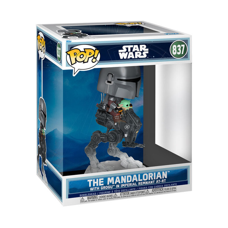 Este Funko POP Rides Deluxe Mandalorian & Grogu AT-RT presenta al Mandaloriano pilotando un AT-RT del Remanente Imperial mientras Grogu lo acompaña, recreando una escena llena de dinamismo y carácter. El vehículo está diseñado con gran nivel de detalle, desde las patas mecánicas hasta la cabina y los acabados inspirados en la estética imperial, aportando profundidad y presencia a la figura. El contraste entre la imponente armadura del Mandaloriano y la pequeña figura de Grogu añade un equilibrio visual que convierte esta pieza en una de las más atractivas de la línea POP Rides Deluxe.