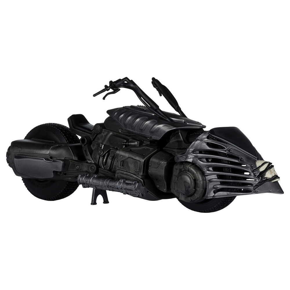 Con 33 cm de largo, este vehículo coleccionable destaca por un diseño agresivo, volúmenes marcados y una silueta reconocible al instante. El modelado reproduce muy bien su estética oscura y mecánica, con un alto nivel de detalle en el frontal, el cuerpo, las texturas laterales y las líneas del asiento. En este tipo de piezas suele emplearse PVC y plástico técnico rígido para mantener definición, resistencia y estabilidad en exposición, algo especialmente importante en un vehículo de este tamaño pensado para lucirse de verdad en vitrina, estantería o zona temática de cine y cómic.