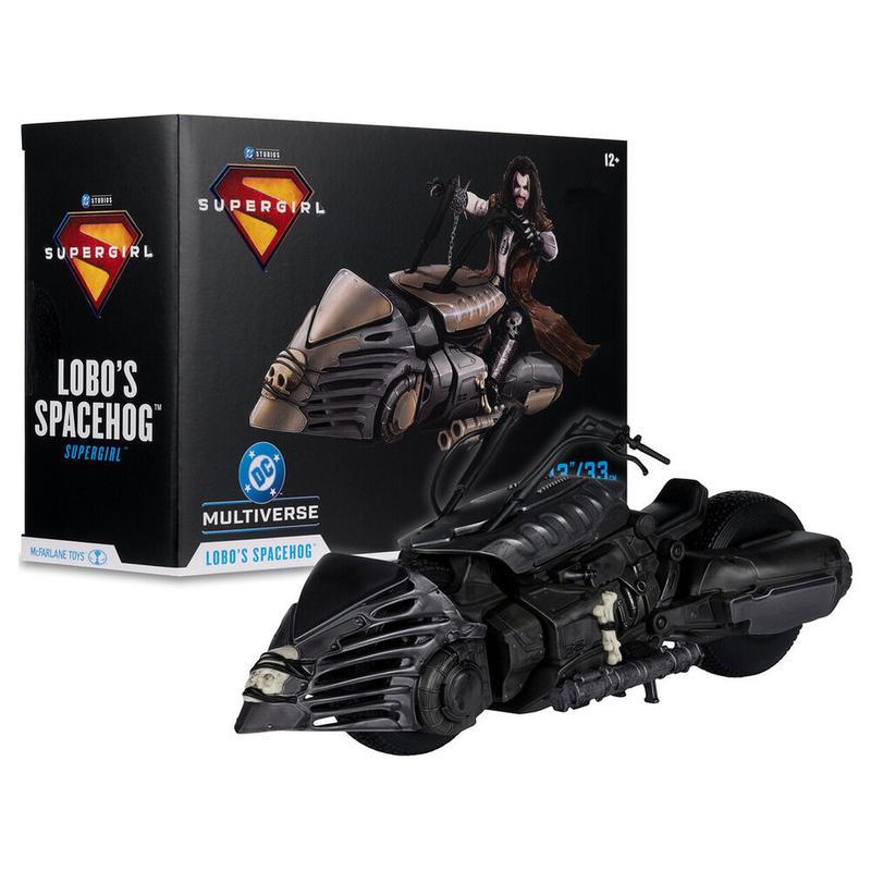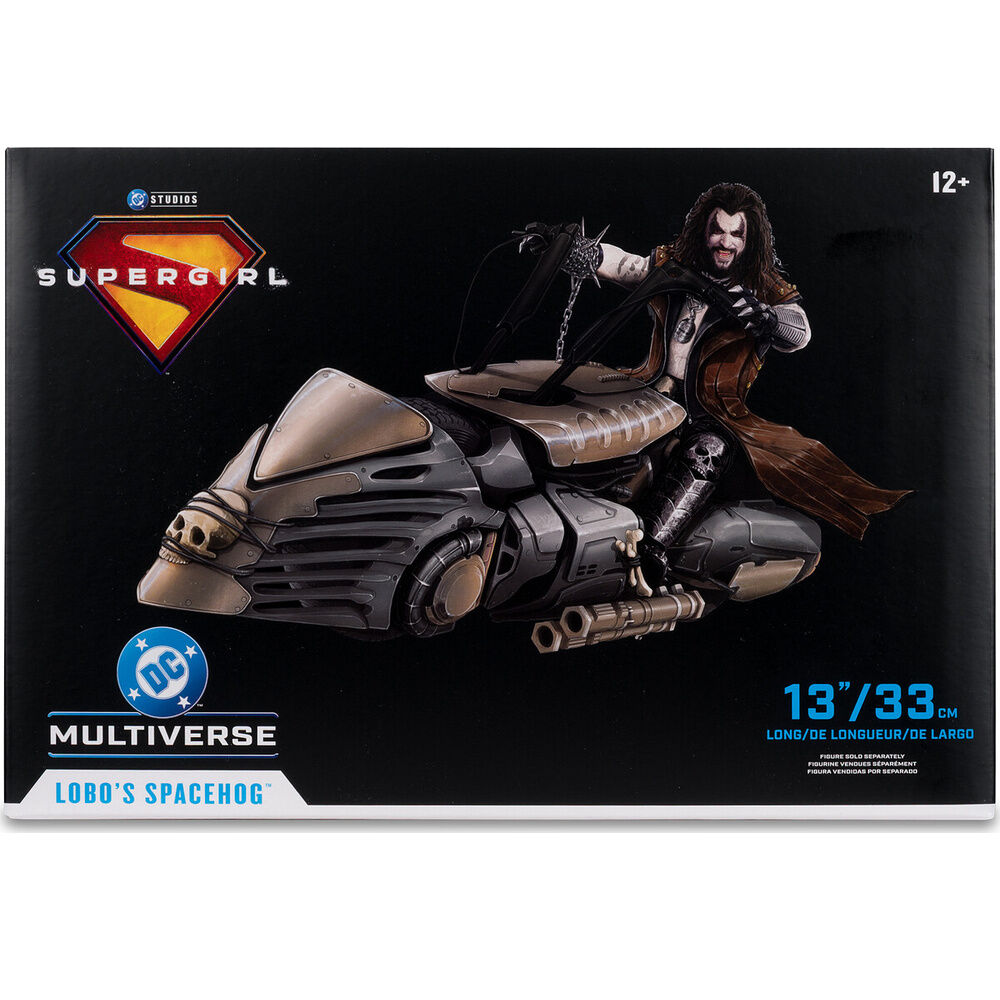 Figura vehículo Lobo's Spacehog 33 cm. No es un simple complemento de exposición, sino una pieza con presencia brutal que transforma por completo cualquier colección dedicada al universo DC y al imaginario más salvaje de Lobo.