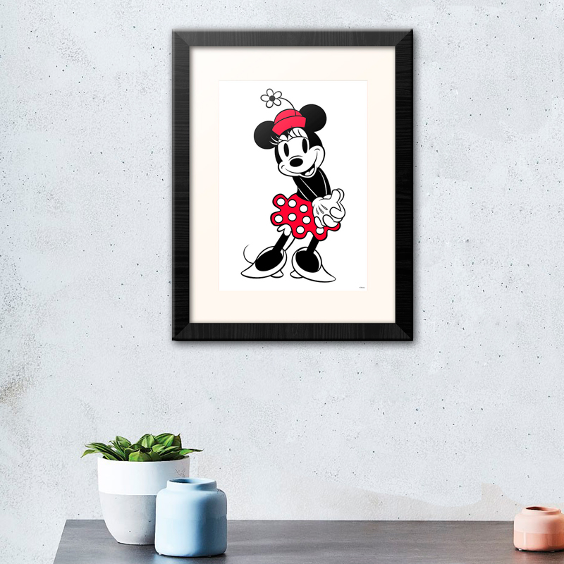 Cuadro oficial de Minnie Mouse el ratón más famoso de la factoría Disney. Disfruta en tu lugar preferido de tu casa o de tu oficina con este cuadro con paspartú de una de las ratoncitas más famosas del cine y tv Un Art Print es una reproducción impresa de una pieza original de arte. Está impreso bajo un acabado con brillo, junto a un marco brillante acorde con la lámina y una calidad de papel muy superior a la de un poster. El Art Print es el complemento ideal para tus paredes. Dará un toque de estilo a tu hogar. Este cuadro tienes unas medidas aproximadas de 30 x 40 cm., y el Art Print tiene un gramaje de 250gr.
