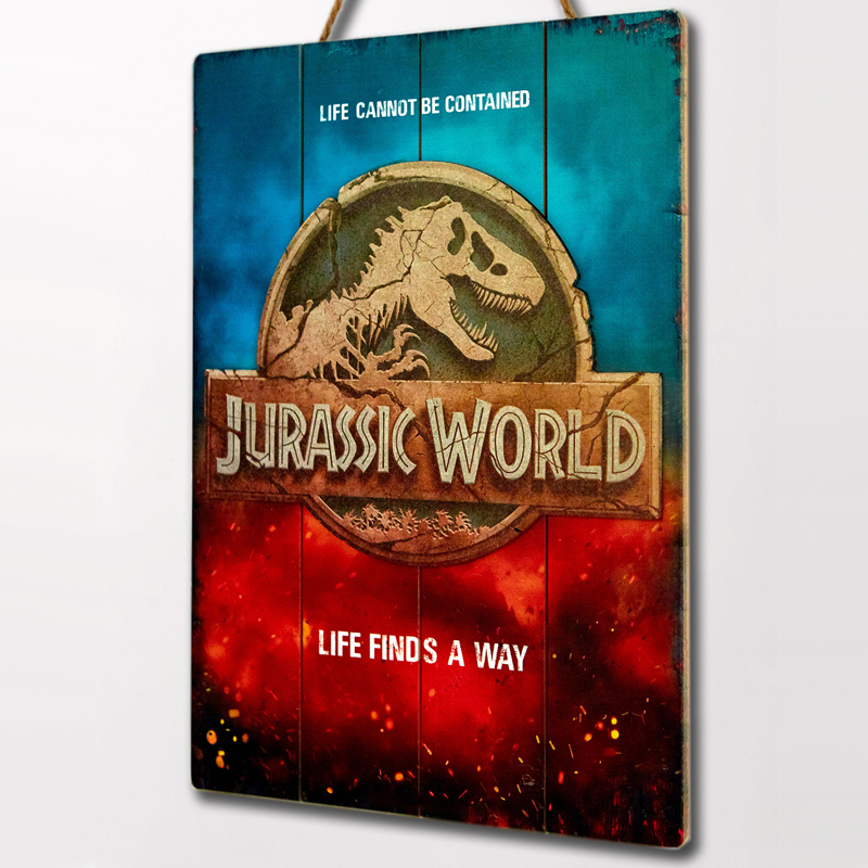 Cuadro de madera WoodArts 3D de Jurassic World. Este precioso cuadro de madera con el logotipo de Jurassic World y la frase “La vida no se puede contener” “La vida se abre camino”. Tiene unas medidas aproximadas de 30 x 40 cm. y vienen listos para ser colgados mediante un cordel. WOODARTS 3D es una colección de carteles de madera de algunas de las películas más icónicas de la cultura popular de las últimas décadas. Elaborados a mano e impresos a todo color directamente sobre madera, WOODARTS 3D tiene la particularidad de presentar motivos resaltados en láminas de madera previamente recortada, y encolada o clavada sobre la superficie, generando un efecto tridimensional con un toque artesanal. Al estar impresos sobre madera real, la beta de ésta puede influir en el aspecto final del cartel, dotando a cada WOODART 3D de peculiaridades gráficas que los diferencian entre ellos y los convierten en un artículo único.