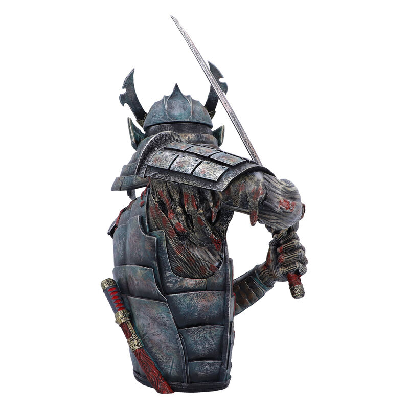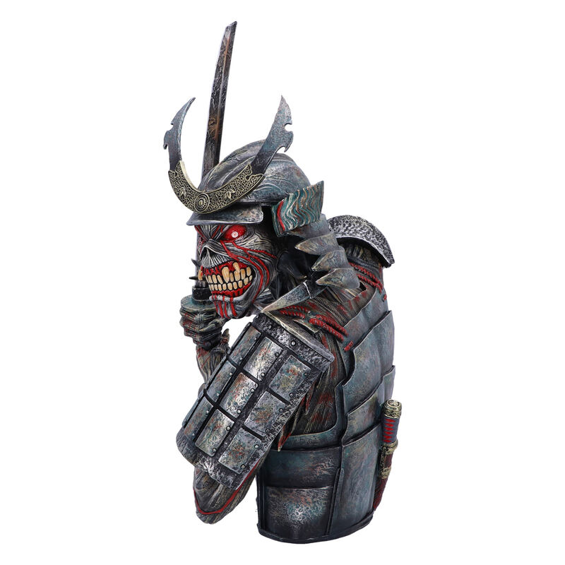 El acero parece recién marcado por la batalla, aunque todo nace de una escultura de resina. Esta caja busto Iron Maiden Senjutsu 41 cm convierte a Eddie samurái en una presencia frontal, oscura y afilada, de esas piezas que no necesitan volumen extra para dominar una vitrina.