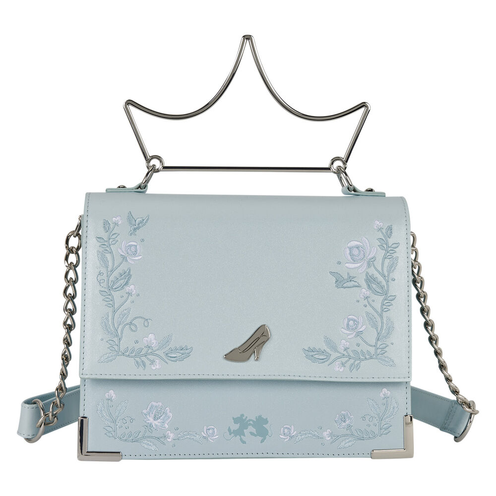Elegancia de cuento con un guiño moderno. El Bolso bandolera Cenicienta de Disney Loungefly luce un azul hielo con destellos finos, bordados florales en relieve y un aplique metálico del mítico zapatito que aporta discreto brillo. La asa superior en forma de corona y la correa de cadena con pieza para el hombro dan versatilidad: mano, hombro o cruzado según el plan. Su silueta estructurada con solapa frontal mantiene la forma y ofrece espacio para móvil, cartera pequeña, llaves y esenciales del día a día, todo en un tamaño cómodo de 22,86 × 7,62 × 20,32 cm que entra perfecto en rutinas urbanas, eventos o parques. Un diseño de colección que combina materiales cuidados, herrajes en acabado plateado y una estética atemporal capaz de elevar cualquier look con un toque de magia.